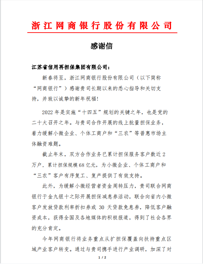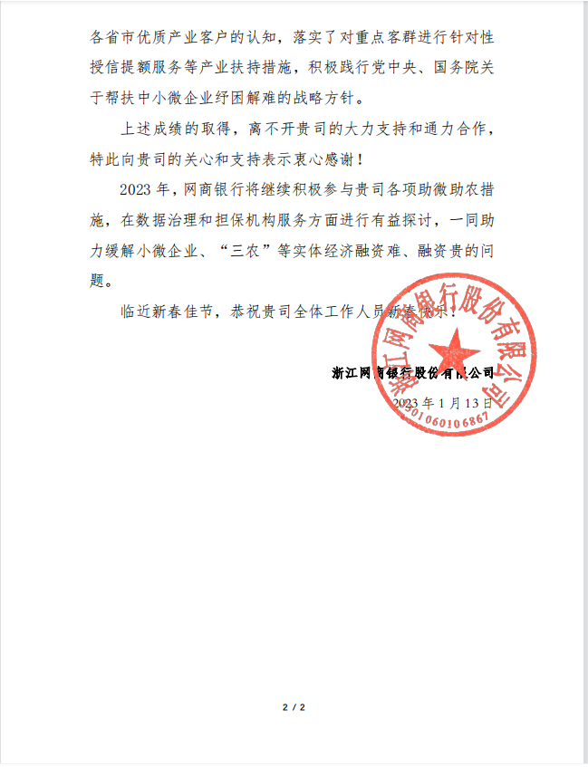 日前,浙江網(wǎng)商銀行向集團(tuán)發(fā)來(lái)感謝信,感謝集團(tuán)在支持地方經(jīng)濟(jì)發(fā)展,扶持小微企業(yè)中做出的突出貢獻(xiàn)。