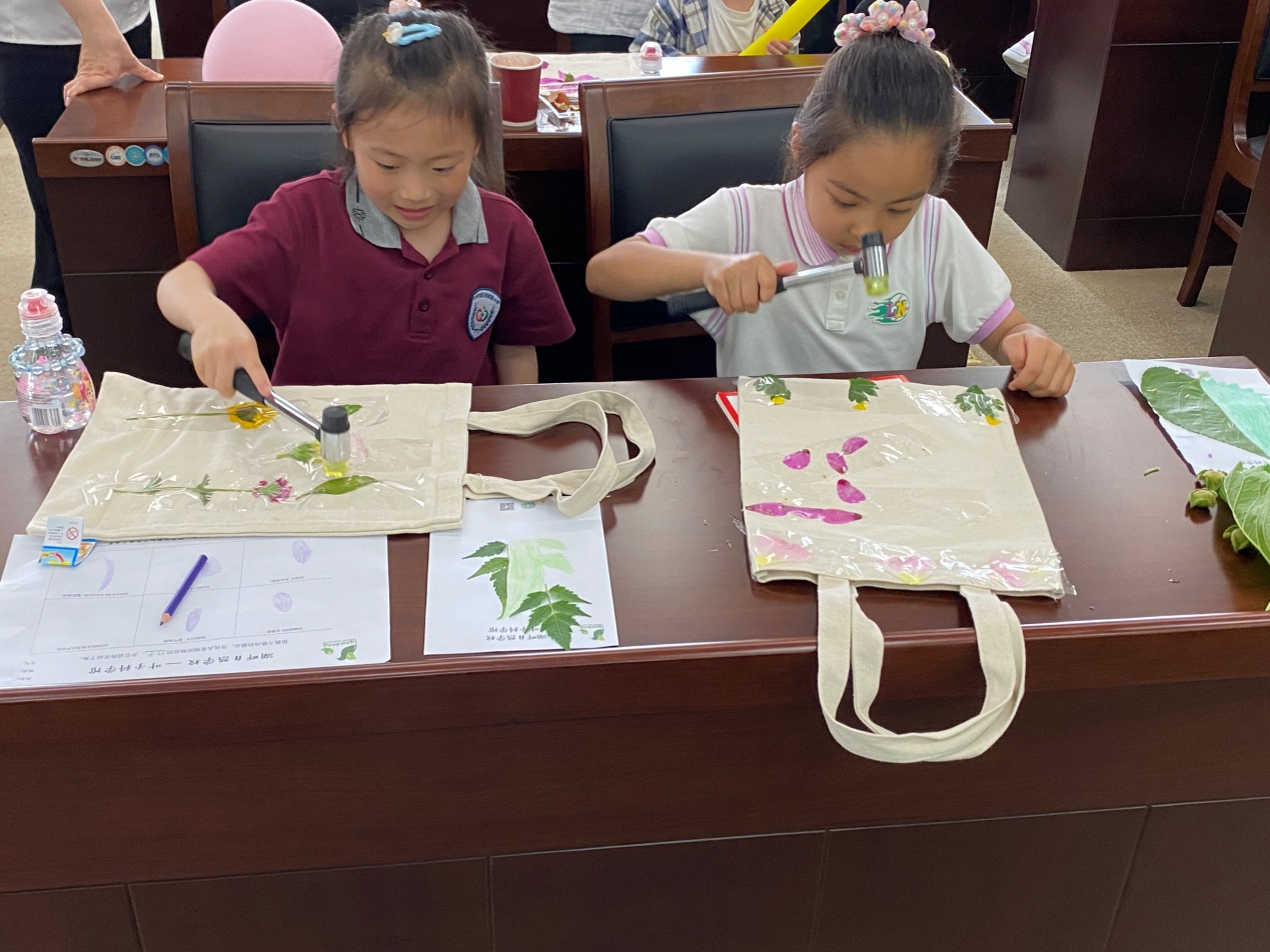 植物拓印,感受自然魅力。為充分發揮孩子們的創造性,鍛煉動手能力,體驗拓印技藝,領略植物之美,孩子們走近大自然,在文慧園采摘自己喜歡的植物葉子。在仔細甄選葉子的同時,認識了許多樹葉的形狀及名稱,感受植物特有的魅力。采摘完畢,孩子們將自己挑選的各式各樣的植物鋪在帆布包上,用小錘子均勻敲打,將植物的顏色敲進布料里,私人定制自然風帆布包。一花一葉,一顏一色,傳遞出大自然最美妙的秘密,孩子們像發現了新大陸,不由得驚嘆,紛紛向同伴及家人展示自己的作品。每一個作品都構思巧妙圖案別致,大家紛紛圍觀點評,欣賞彼此的藝術想象力和辛勤勞動的成果,感受著欣喜與快樂。