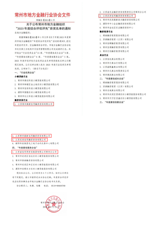 2月28日,常州市地方金融行業協會公布了地方金融組織“2023年度綜合評優評先”獲獎名單,常州地區分子公司榜上有名,常州分公司榮獲“年度最佳服務企業”,武進擔保和常州高新擔保公司均連續榮獲“行業優秀企業”,同時被評為“年度最佳創新企業”。