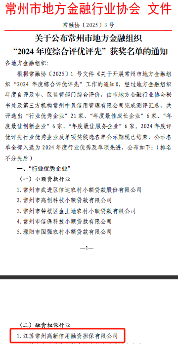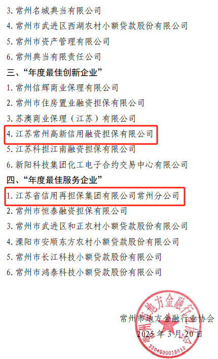 3月20日,常州市地方金融行業協會發布了“2024年度綜合評優評先”獲獎名單,常州一體化區域兩家機構再度獲評。迄今為止,常州分公司已經連續2年獲評“年度最佳服務企業”,常州高新擔保公司連續4年成為“行業優秀企業”,并接連2年獲評“最佳創新企業”。