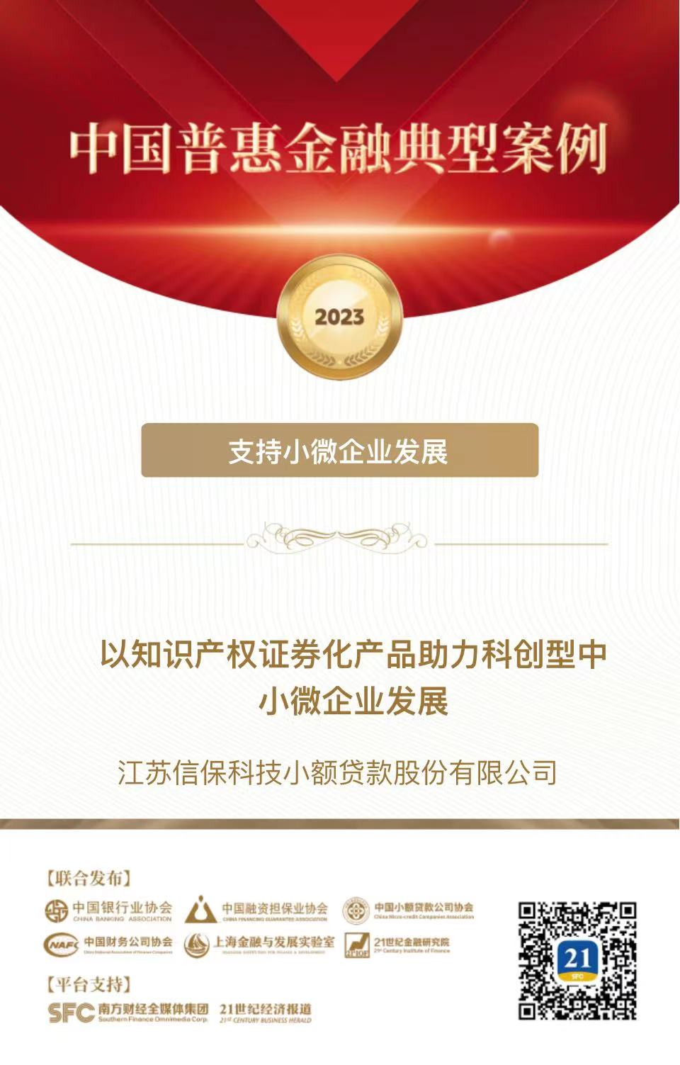 9月19日,“合普惠 新金融——2023中國普惠金融創(chuàng)新發(fā)展研討暨典型案例發(fā)布會”在北京舉辦,“中國普惠金融典型案例(2023)”名單在會上正式揭曉,由江蘇信保科技小額貸款股份有限公司(下稱“信保科貸”)報送的《以知識產(chǎn)權(quán)證券化產(chǎn)品助力科創(chuàng)型中小微企業(yè)發(fā)展》案例從全國761個參評案例中脫穎而出,入圍“支持小微企業(yè)發(fā)展案例”。