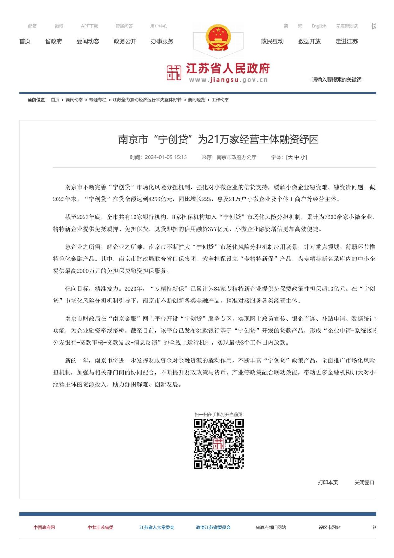 近日,江蘇省人民政府官網(wǎng)以《南京市“寧創(chuàng)貸”為21萬家經(jīng)營主體融資紓困》為題,對南京一體化區(qū)域的“寧創(chuàng)貸”市場化風(fēng)險分擔(dān)機(jī)制進(jìn)行了宣傳報(bào)道,充分肯定了“寧創(chuàng)貸”市場化風(fēng)險分擔(dān)機(jī)制及其包含的“專精特新保”產(chǎn)品在助企融資紓困方面取得的成效。