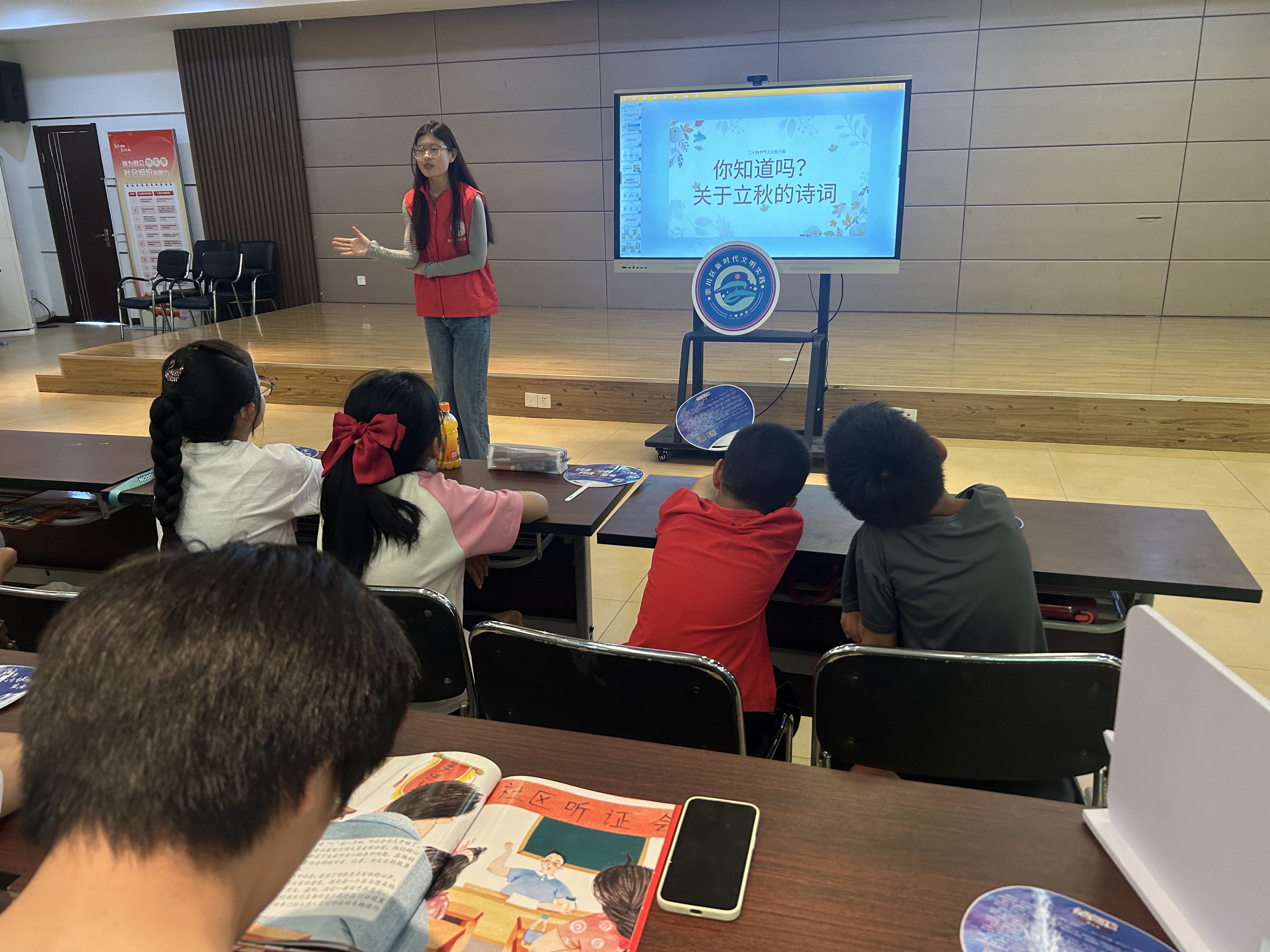 “自古逢秋悲寂寥,我言秋日勝春朝……立秋,是二十四節(jié)氣中的第13個(gè)節(jié)氣……”活動(dòng)現(xiàn)場(chǎng),志愿者通過(guò)劉禹錫的《秋辭》向孩子們講述了二十四節(jié)氣之“立秋”由來(lái)、立秋的習(xí)俗,并通過(guò)《立秋》繪本,向孩子們展示立秋節(jié)氣前后自然萬(wàn)物變化,加深孩子們對(duì)立秋的認(rèn)識(shí)。在交流互動(dòng)環(huán)節(jié),孩子們圍繞對(duì)立秋的認(rèn)識(shí)紛紛舉手發(fā)言,并用畫(huà)紙描繪出各自記憶中秋天的獨(dú)特景象。最后,志愿者們結(jié)合專業(yè)特長(zhǎng),對(duì)孩子們的繪畫(huà)進(jìn)行引導(dǎo),并提出專業(yè)建議,幫助孩子們充分釋放想象力,惟妙惟肖地展現(xiàn)出了立秋啃西瓜、秋天豐收的特別景象,每幅作品都洋溢著童真與樂(lè)趣,展現(xiàn)了孩子們對(duì)這個(gè)季節(jié)的深切喜愛(ài)與獨(dú)特情感。