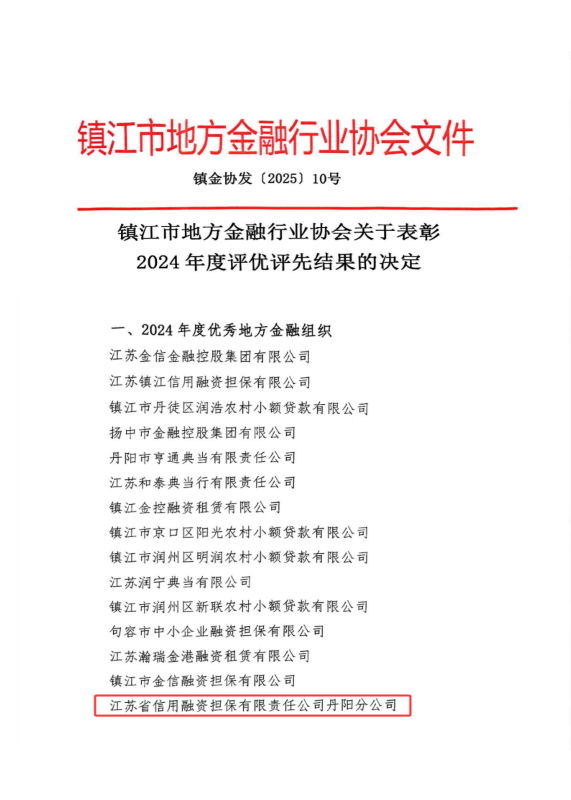 日前,省擔保丹陽分公司榮獲鎮(zhèn)江市地方金融行業(yè)協(xié)會授予的2024年度“優(yōu)秀地方金融組織”稱號。