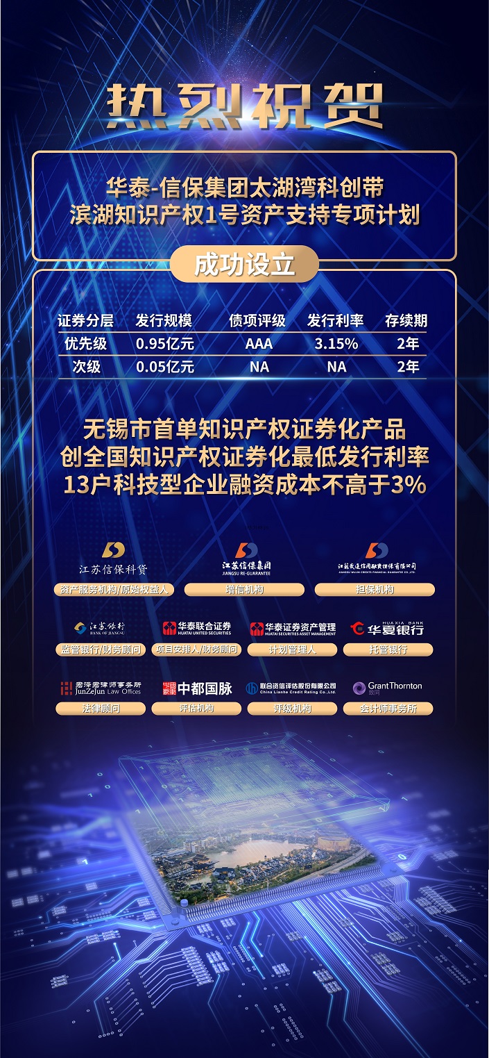 5月30日,由集團增信、科貸公司作為原始權益人的集團首單知識產權ABS項目——“華泰—信保集團太湖灣科創帶濱湖知識產權1號資產支持專項計劃”在交易所成功發行。項目儲架規模5億元,首期1億元, 期限2年,發行利率3.15%,創全國知識產權證券化發行利率新低。
