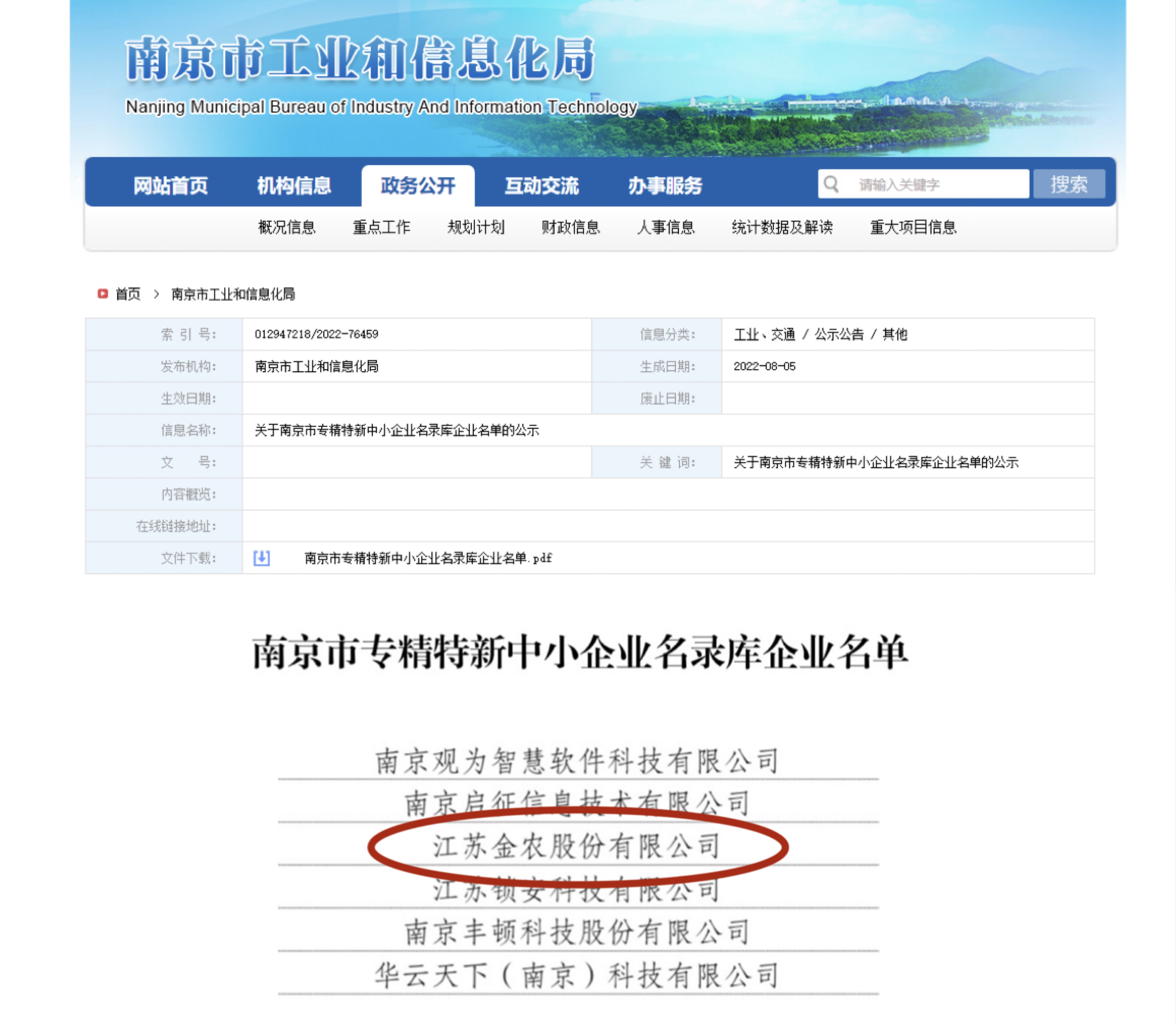 近日,南京市工業(yè)和信息化局、市人民政府促進(jìn)中小企業(yè)發(fā)展工作領(lǐng)導(dǎo)小組辦公室發(fā)布《關(guān)于南京市專(zhuān)精特新中小企業(yè)名錄庫(kù)企業(yè)名單的公示》,金農(nóng)公司憑借優(yōu)秀的技術(shù)創(chuàng)新能力與優(yōu)異的市場(chǎng)表現(xiàn)成功入選名單。