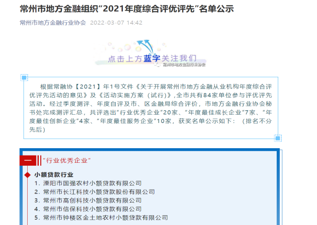 此次評選活動由常州市地方金融行業協會組織開展。綜合考慮參評單位經營狀況、風險防控、創新發展、服務中小微等因素,經季度測評、年度自評以及市、區金融局綜合評價,評選出小額貸款、融資擔保、融資租賃、典當等地方金融“行業優秀企業”20家,本次獲此獎項的小貸公司僅5家。