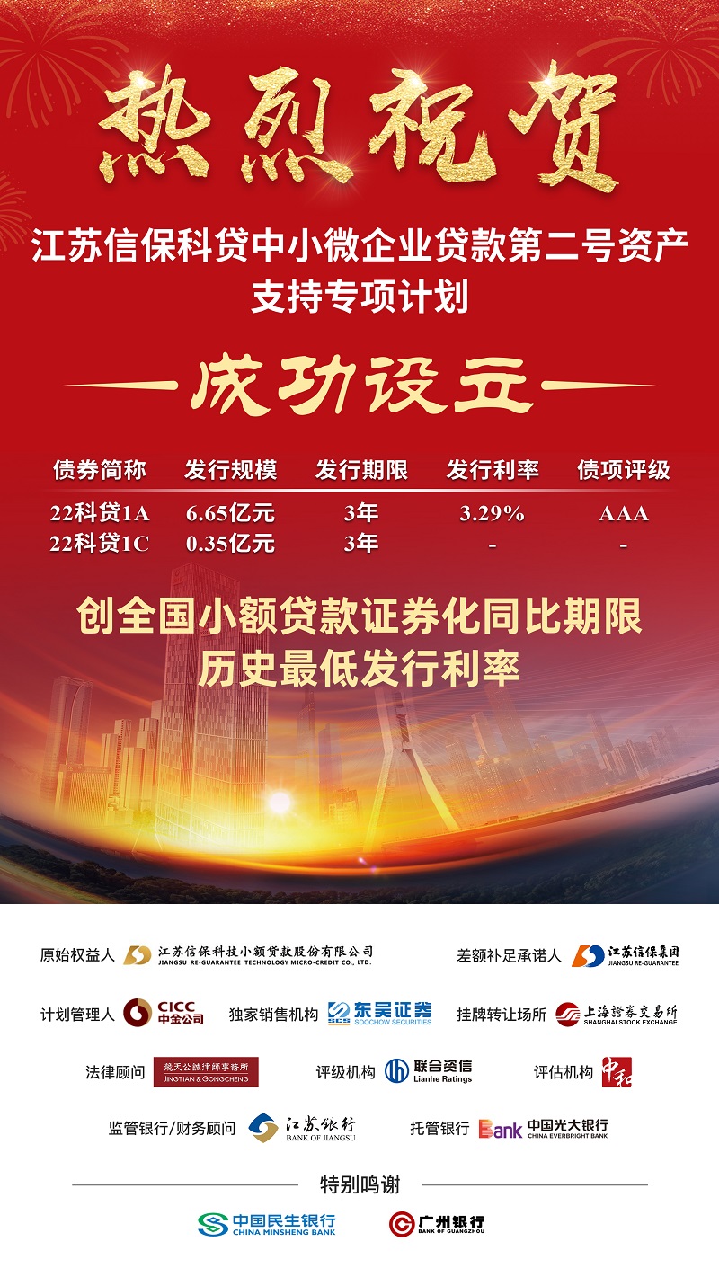 6月28日,江蘇信保科貸中小微企業(yè)貸款第2期資產(chǎn)支持專項(xiàng)計(jì)劃成功發(fā)行,該項(xiàng)目總規(guī)模20億元,本次發(fā)債規(guī)模7億元,期限3年,票面利率3.29%,創(chuàng)全國(guó)3年期小額貸款A(yù)BS利率最低水平。