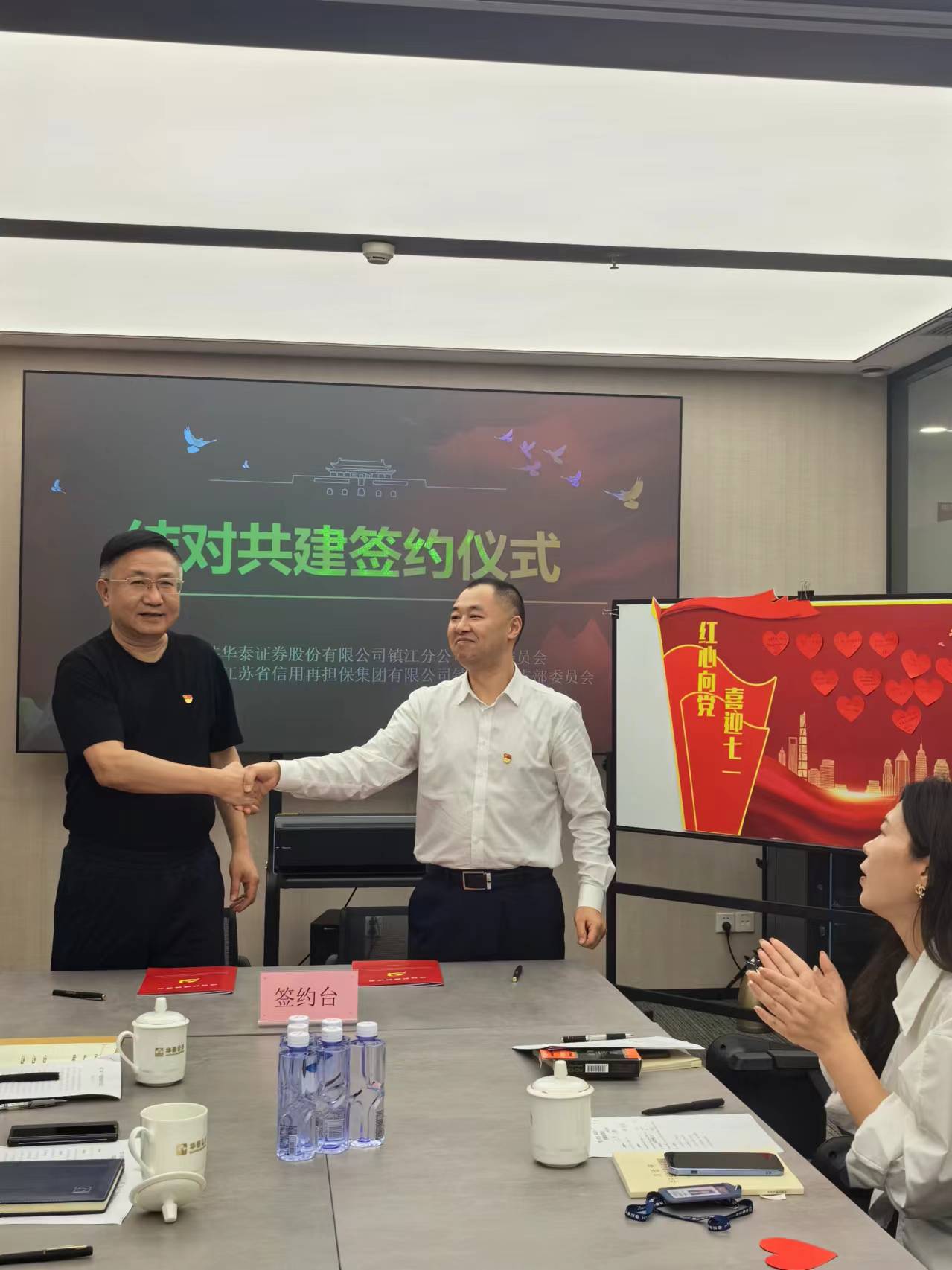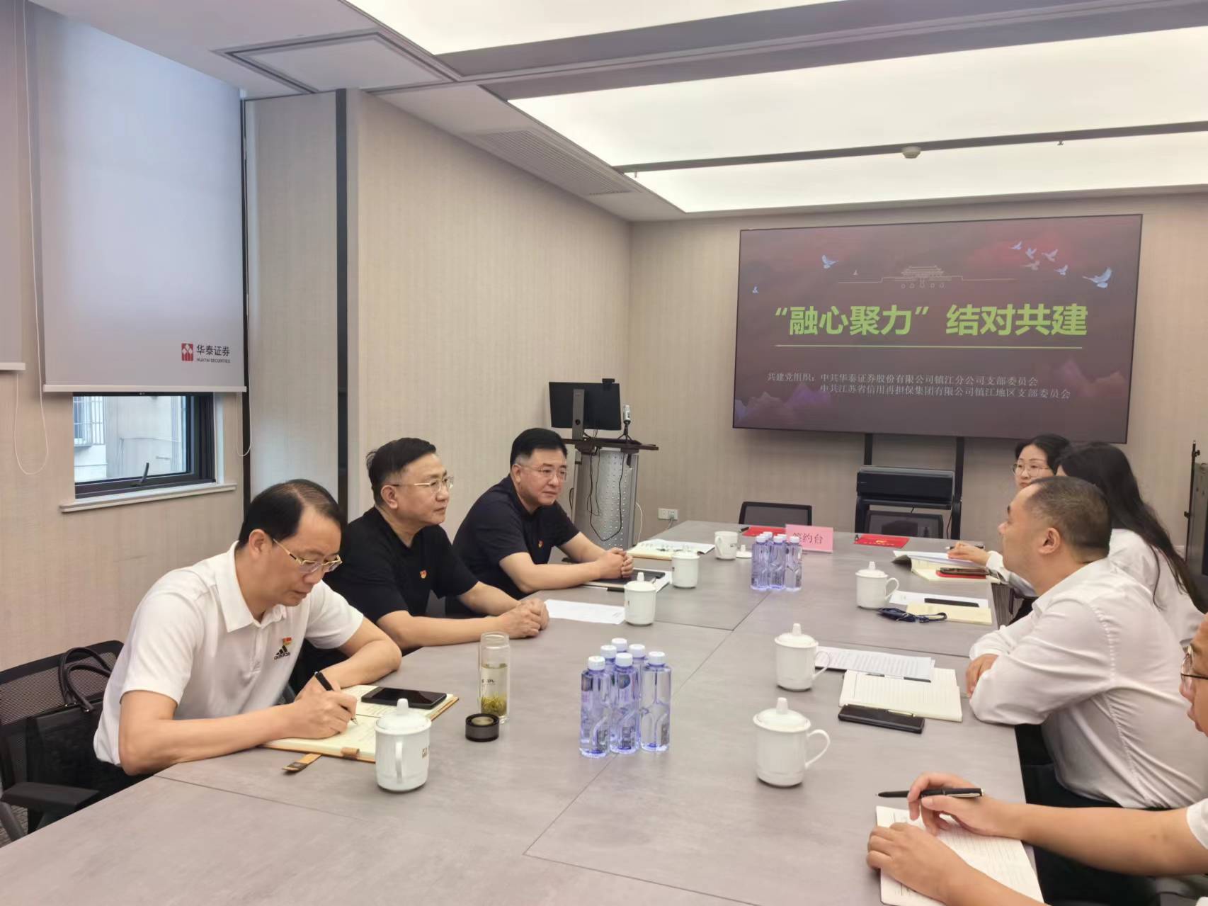 共建活動中,雙方單位分別介紹了各自公司的黨建工作情況、業務開展情況以及在服務地方經濟中所取得的成績。鎮江擔保分享了如何通過信用擔保為中小企業提供融資支持,助力實體經濟發展的經驗;華泰證券鎮江分公司介紹了在資本市場領域的專業服務和創新舉措。通過交流,雙方增進了對彼此的了解,為進一步合作奠定了基礎。