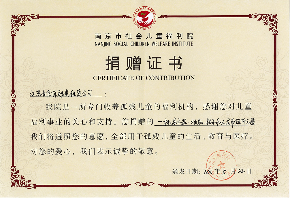 在端午節(jié)和“六一”兒童節(jié)雙節(jié)來臨之際,信保租賃走進南京市社會兒童福利院開展愛心捐贈活動。公司員工及子女積極響應(yīng)此次公益活動,以實際行動踐行社會主義核心價值觀。共有45名員工參與捐贈,共籌得善款7250元,其中5000元用于公益捐贈,剩余款項為福利院購置一批尿不濕、紙巾、粽子等生活物資,為孩子們的成長注入一份溫暖與關(guān)懷。